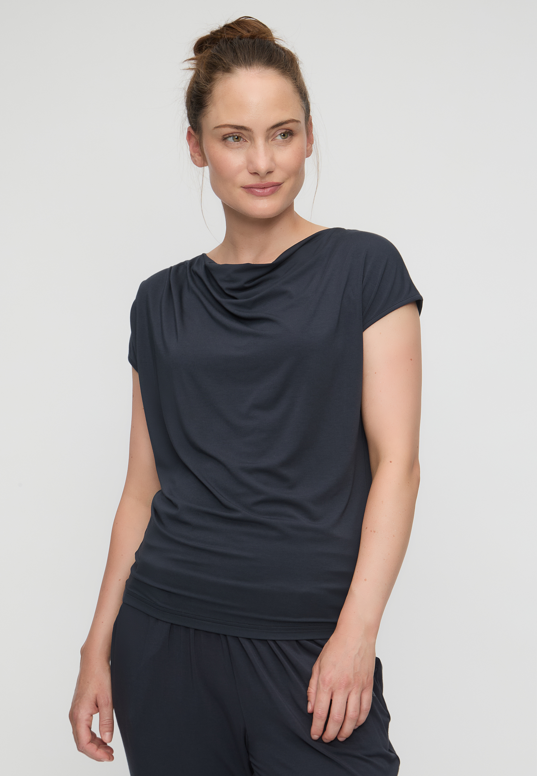 Ein kleines Designerstück: der lässige Wasserfallkragen macht aus diesem Yogatop ein Passformwunder, mit dem du von der Matte auch direkt auf die Party kannst!